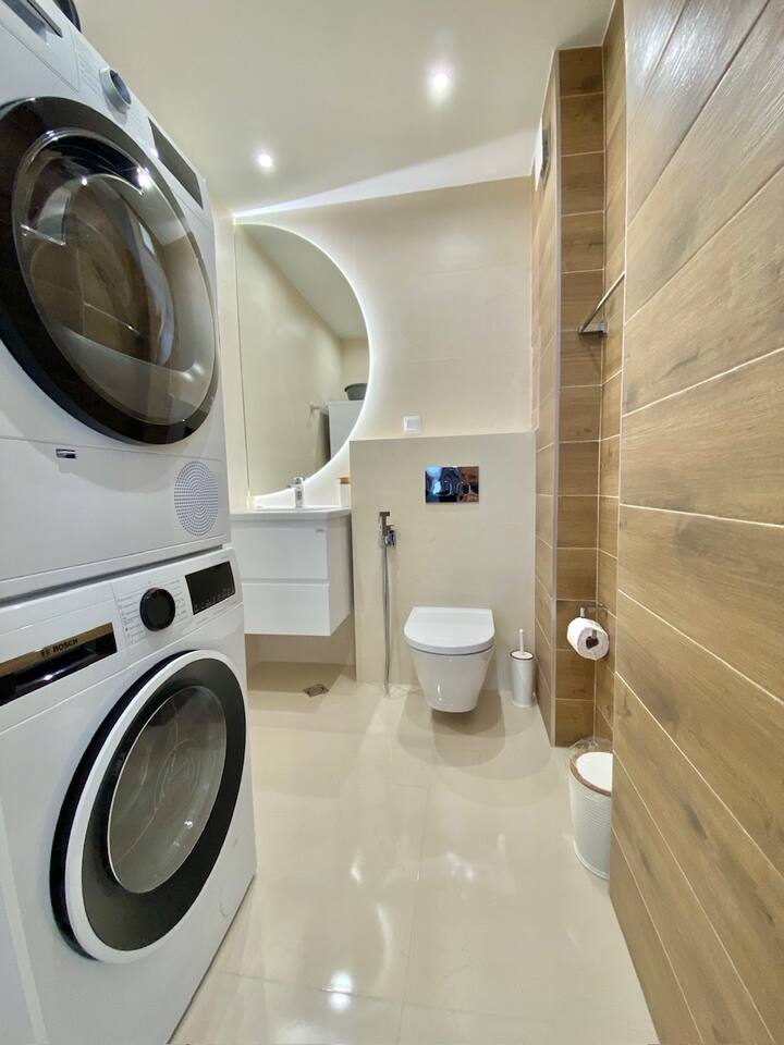 The apartments layout consists of one bedroom, a kitchen, a living room with dining area, a balcony, one bathroom and one additional toilet. In the living room there is: • big and comfortable sofa; • TV; • dining area for six; The kitchen is supplied with: • fridge, oven and stoves; • coffee machine, electric kettle & toaster; • microwave; In the bedroom there is: • a comfortable bed; • wardrobe; • TV; The bathroom is equipped with shower, washing sink and toilet.There is also an additional toilet and washing machine.