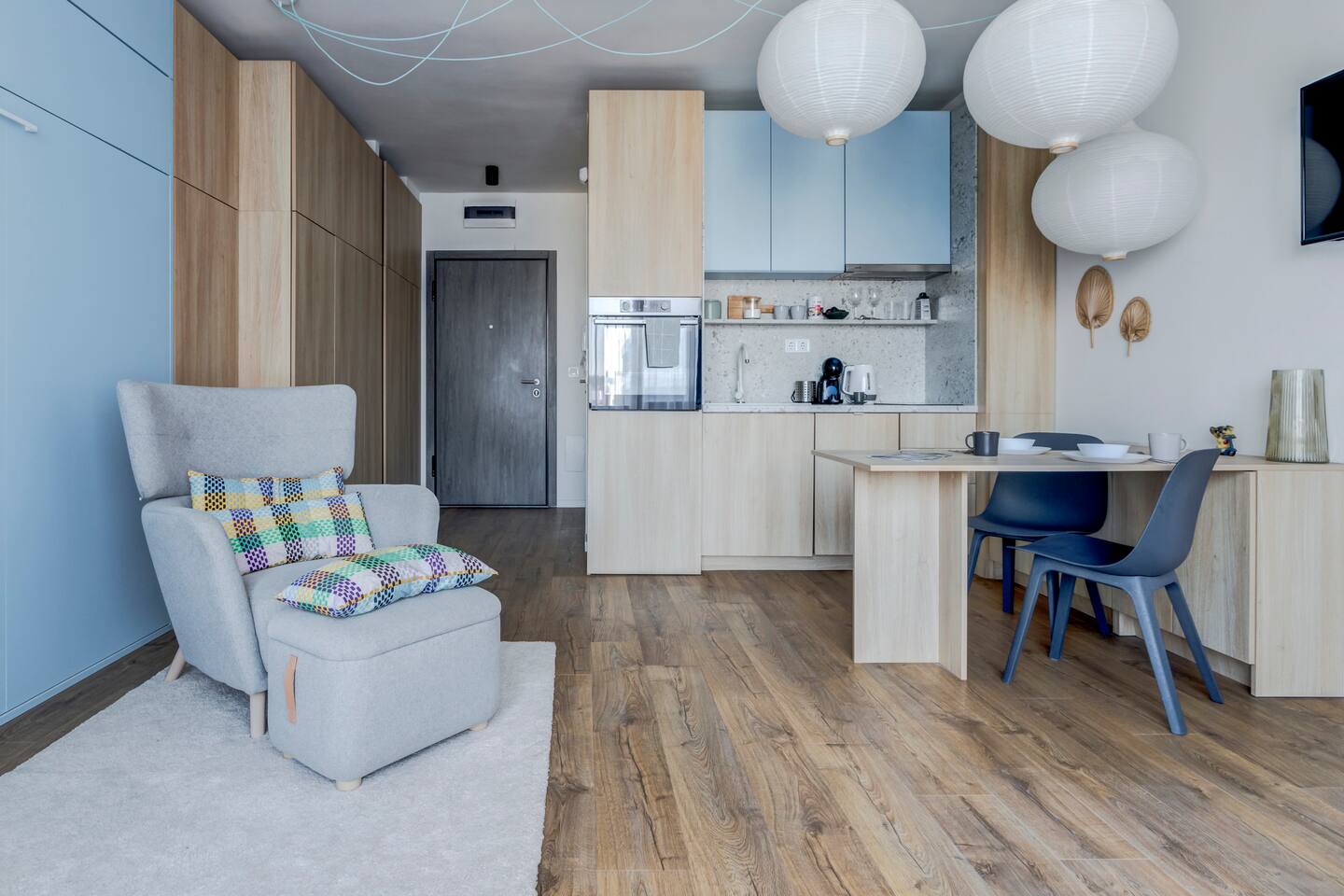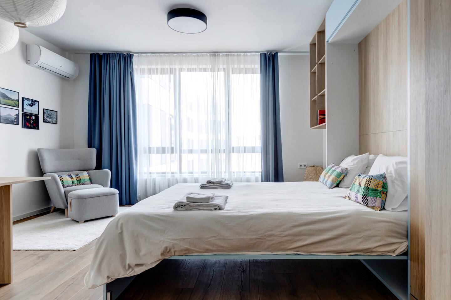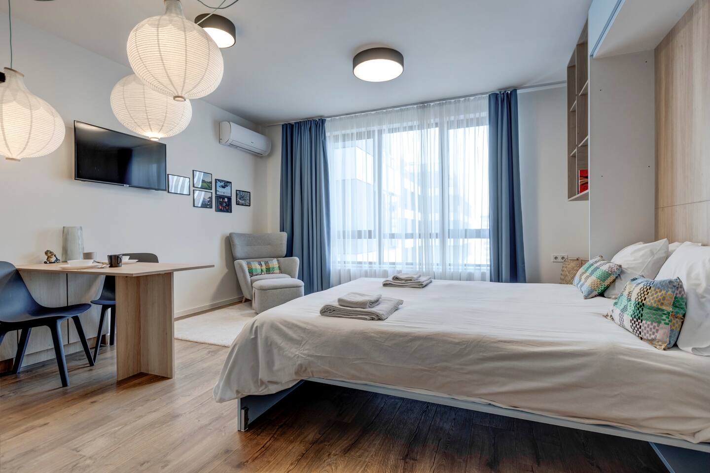 Welcome to our stylish 7th-floor studio in a modern complex with an elevator. Perfect for solo travellers or couples, it's a 3-minute walk to the metro and an 11-minute ride to Sofia's top spots. Guests rave about the easy check-in process, exceptional cleanliness, and thoughtful touches like a coffee machine with pods provided. The Murphy bed maximizes space, and the apartment's quiet location ensures a restful stay. Nearby 2 supermarkets and pharmacies make it even more convenient.