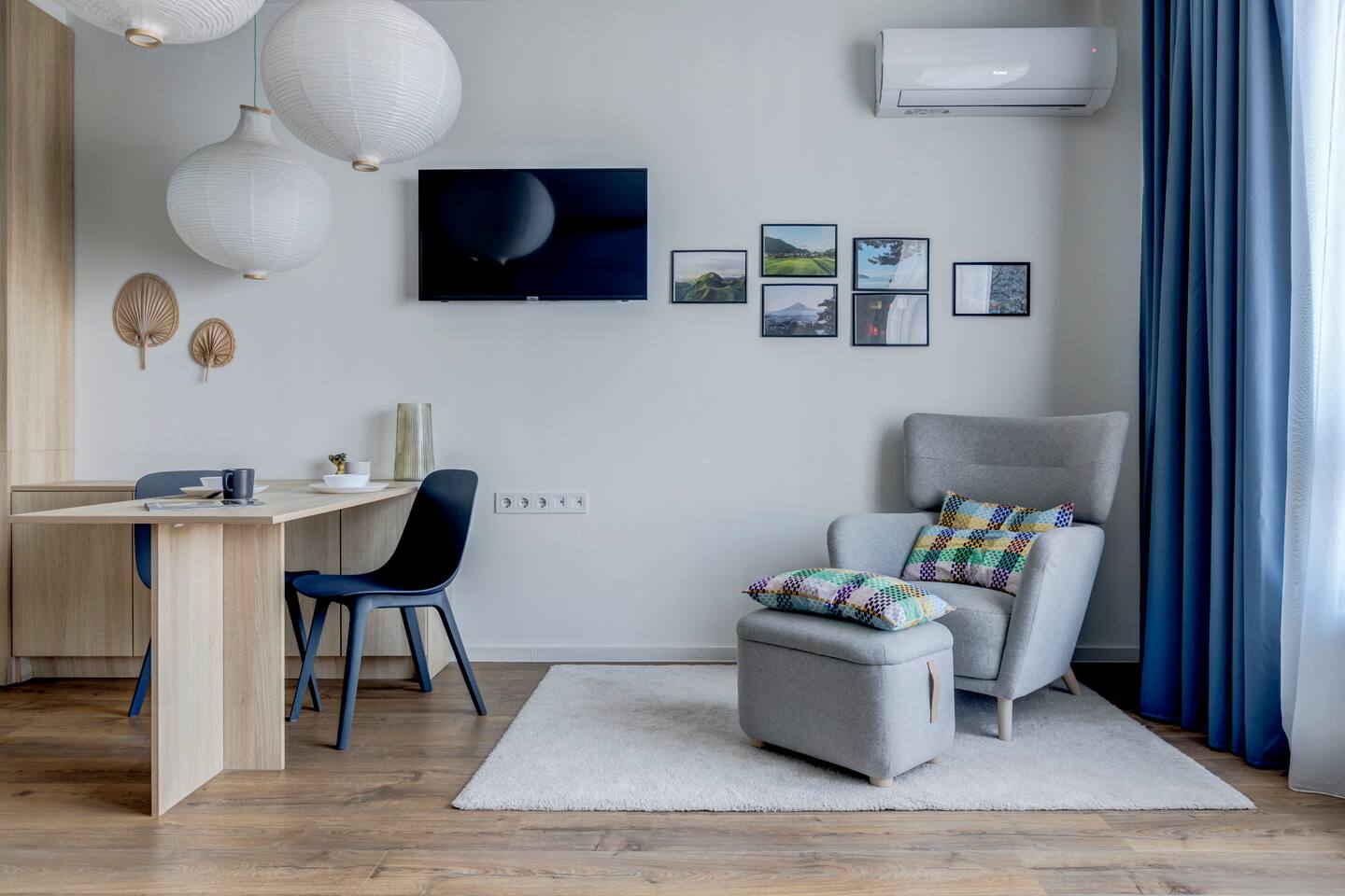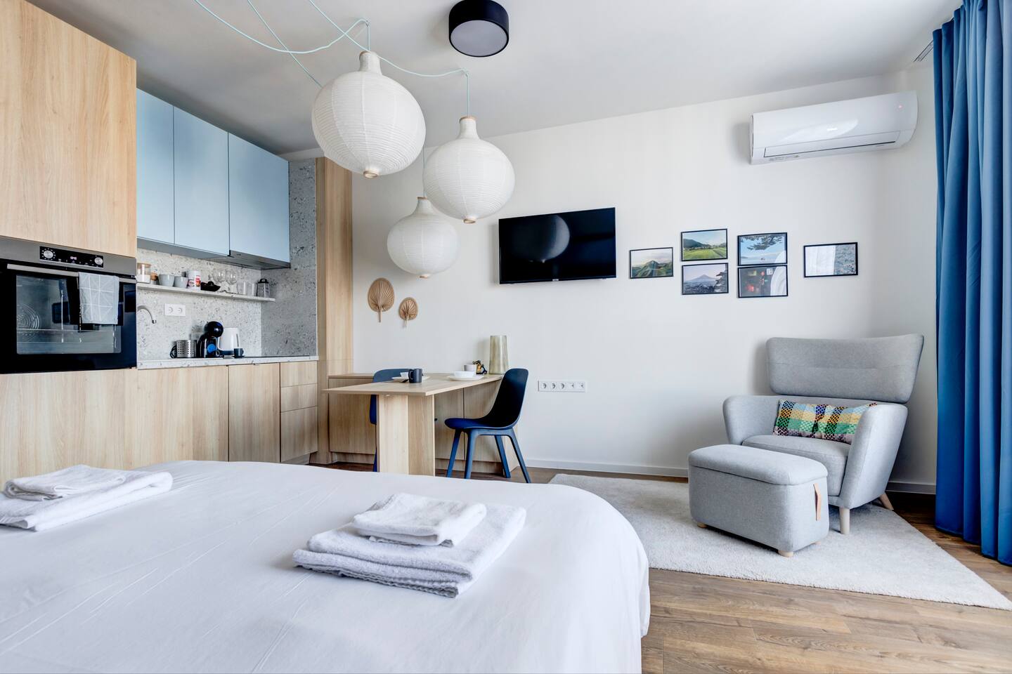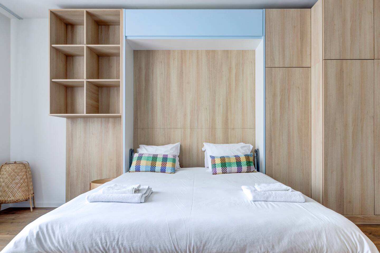 - 160x200cm Murphy bed - Fast Wi-Fi (88 Mbps) - 42" HDTV with Netflix and premium cable - Fully equipped kitchen with espresso machine, stove, and dishwasher - In-unit washer and dryer - Dedicated workspace - Modern bathroom with walk-in shower - Extra pillows, blankets, and room-darkening shades - AC and heating (split-type ductless system) - Family-friendly (crib and pack 'n play available on request)