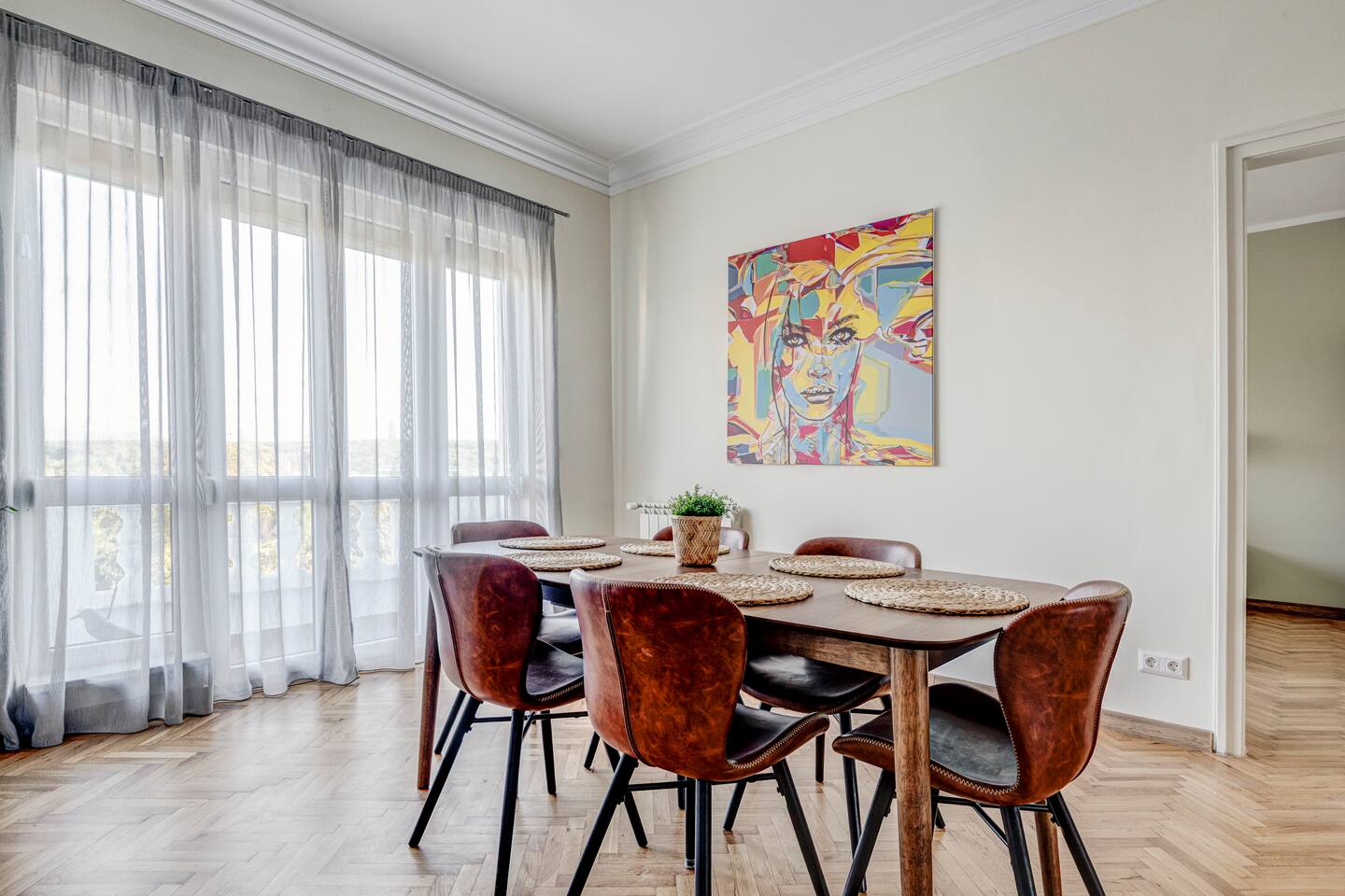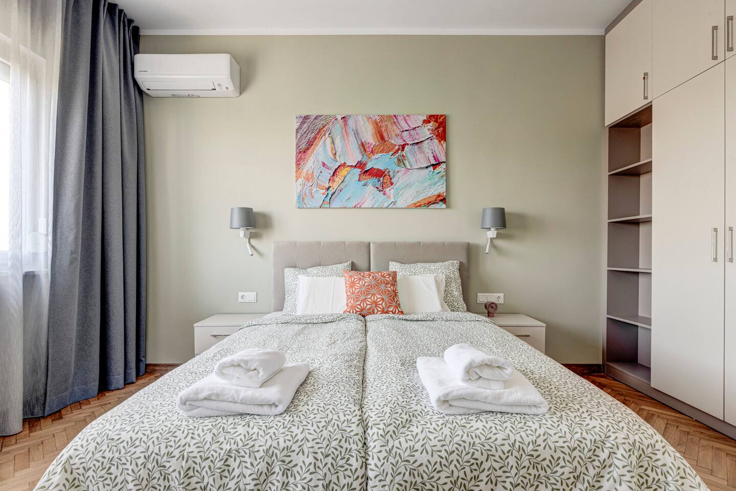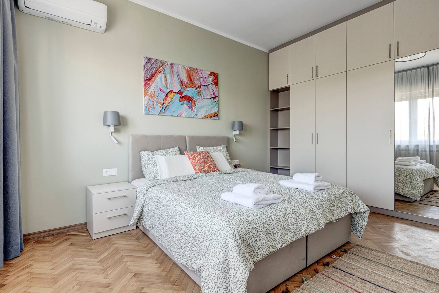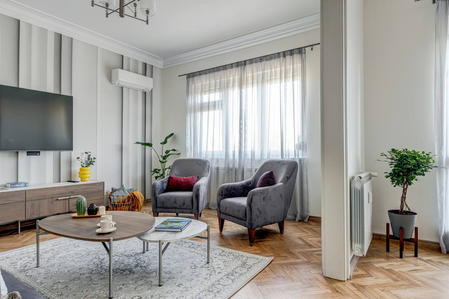 Our fully renovated apartment offers two cozy bedrooms, a modern bathroom, and a separate restroom. It’s thoughtfully designed and equipped with everything you need for a comfortable stay — whether you’re here for a weekend getaway or a longer visit. Relax in the bright living room with a smart TV and large windows overlooking Sofia University and one of the city’s most charming historic parks. The apartment also has an elevator for easy access.