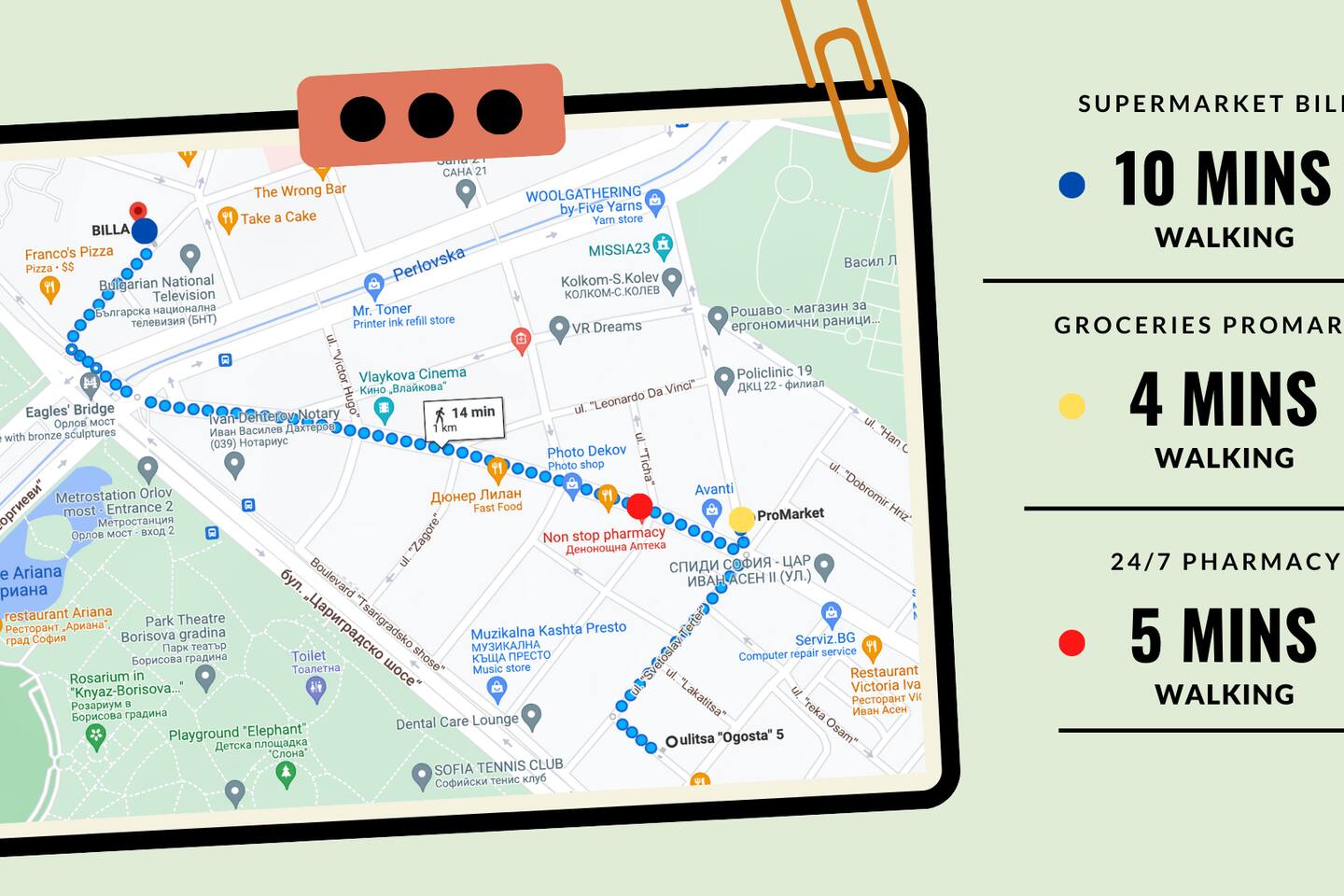 ★ CLEANING & SANITIZATION ★ Health, safety, and well-being of our guests are of utmost importance. For this reason, we use a thorough cleaning process after each check-out. ★ PRIVATE TRANSFER SERVICE ★ Enjoy a seamless journey to our apartment with our transfer service, in partnership with local drivers. Benefit from quick booking, meet-and-greet service, and real-time updates. Relax with our friendly, English-speaking drivers at competitive rates. Feel free to contact us with any additional questions you might have. A new apartment in a new building with an elevator. The common areas of the building are great, new, clean and very well-maintained. There is a beauty salon on the ground floor, so they could take full care of you while. The apartment is on the top floor. The largest park in the central part of Sofia is located just across the street. This is Boris's Garden Park named so in honour of Tsar Boris III. A fantastic place to feel like a local while enjoying Sofia!