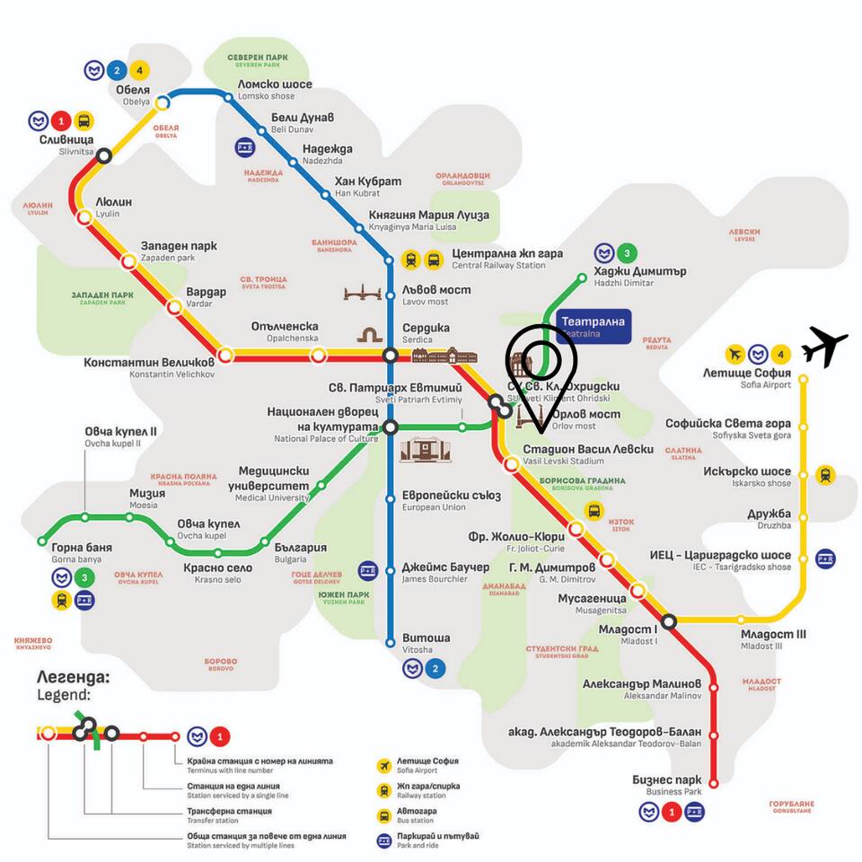 Yavorov is a laid-back, artsy residential neighborhood, offering a perfect mix of tranquility and vibrant city life. The main street, "Tsar Ivan Asen II", is lined with hip cafes, juice bars, and cozy Bulgarian restaurants, making it a great spot to relax and indulge in local flavors. A short walk takes you to Borisova Garden, Sofia’s largest park, ideal for a leisurely stroll, jogging, or just soaking in the natural beauty. This historic park features scenic trails, a serene lake, and various sports facilities. Nearby is the iconic Alexander Nevski Cathedral, along with the Parliament and other significant landmarks. From the loft to Sofia's main attractions: 10 min walk to Alexander Nevski Cathedral and the Parliament 5 min walk to Sofia's central park - Borisova Gradina Getting Around Our loft offers excellent connectivity to Sofia’s key locations: From Sofia Airport: 30 min from Terminal 2 via subway M2 line, exit at Sofia University stop near Eagles' Bridge, followed by a 5-6 min walk to the loft. 45 min from Terminal 1 (low-cost) by bus 184, exit at Eagles' Bridge, then a 4-5 min walk to the loft. From Central Train/Bus Station: 20 min from Central Train Station via subway M2 line, exit at Sofia University stop near Eagles' Bridge, followed by a 5-6 min walk to the loft. To Business Park Sofia: 5-6 min walk to the Sofia University subway stop, then a 30 min ride on the M1 line to Business Park Sofia. With such convenient transport links and proximity to major attractions, getting around Sofia is easy and enjoyable, whether you prefer walking or public transit.