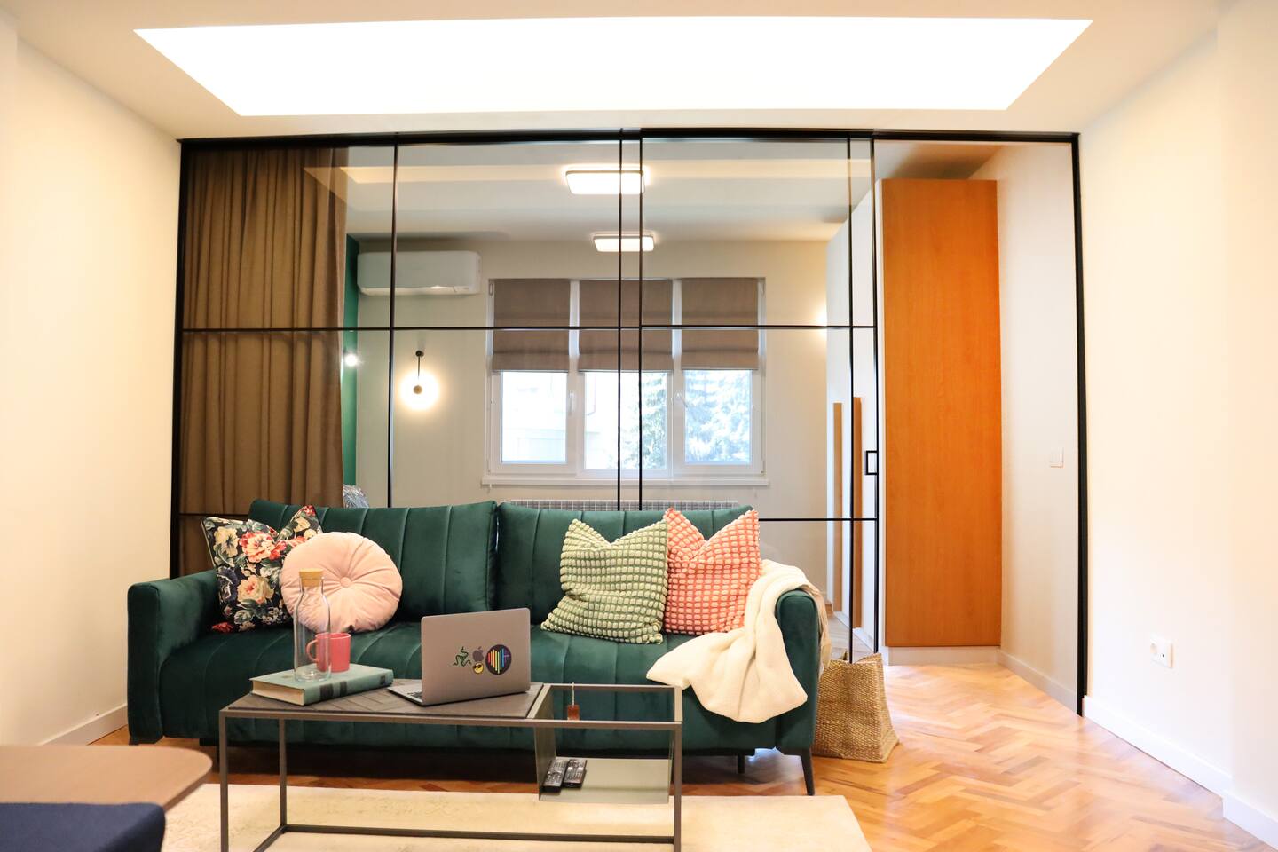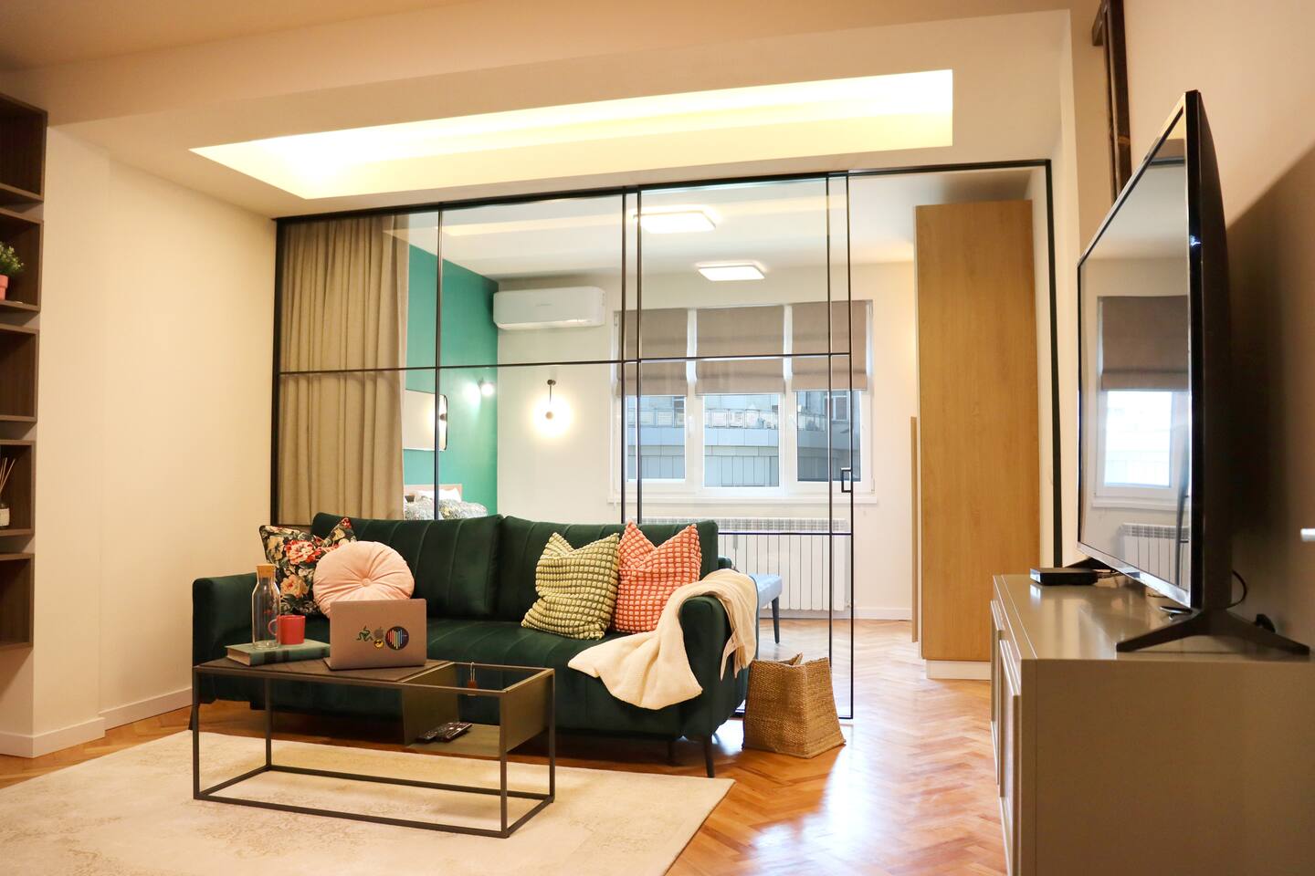 Enjoy a stylish experience next to the National Palace of Culture and the famous pedestrian “Vitosha” blvd. Fully renovated. Features a sliding glass wall between the living room and the bedroom, a fully equipped kitchen, a balcony, air conditioning and an LG Smart TV. A brand new flat in the most centric Sofia location that makes you smile when coming home to it.